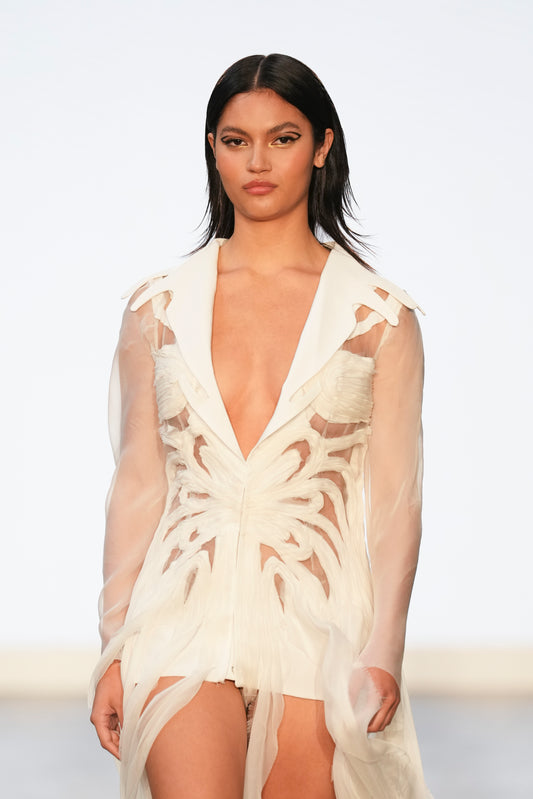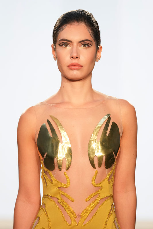 Un capolavoro di eleganza sartoriale e audacia creativa, questo abito giallo è un omaggio al lusso contemporaneo. Realizzato con tessuti pregiati dalla texture delicata, si distingue per la sua vibrante tonalità di giallo solare, che cattura lo sguardo e avvolge chi lo indossa in una luminosità magnetica.